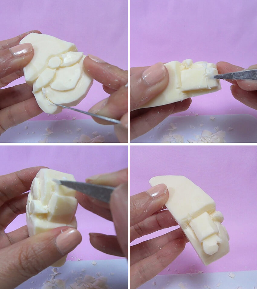 Następnie, trzymając nóż pod kątem blisko mydła i odetnij mydło wokół nosa.