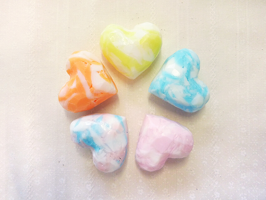 Mini heart soap can be very easily cut from soap flakes. They can be packed to the containers which can be used as decorations or the container of the soaps for multiple uses.