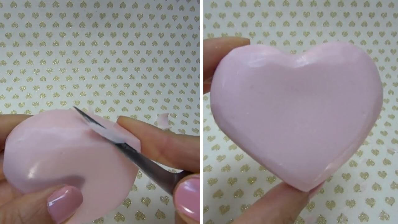 1.12 Holding the knife horizontally to the soap, thinly cut the soap inside the heart shape.