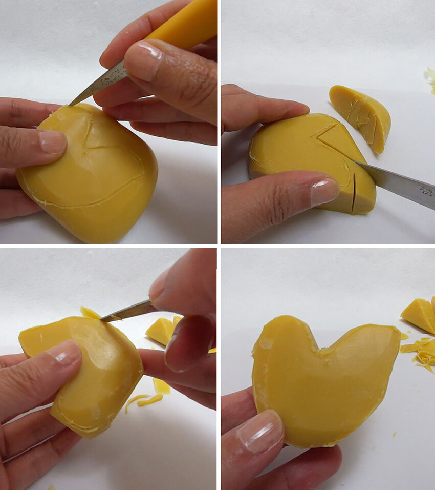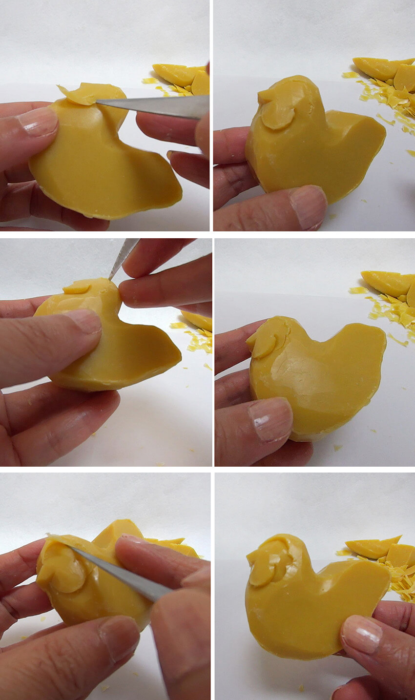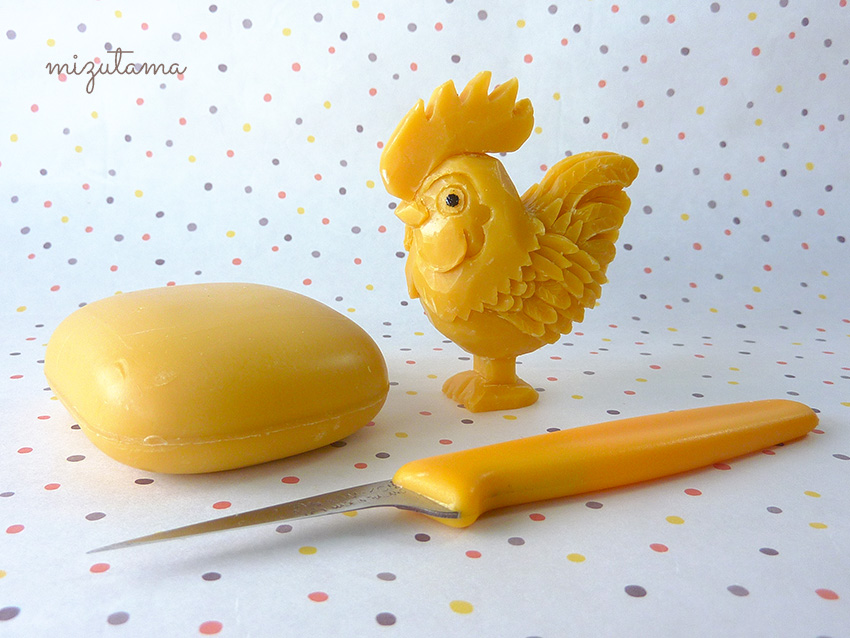2. Cut out the rooster's shape a bit bigger than the outline you traced with a paring knife. Then, cut off the excess soap along the outline with a carving knife.