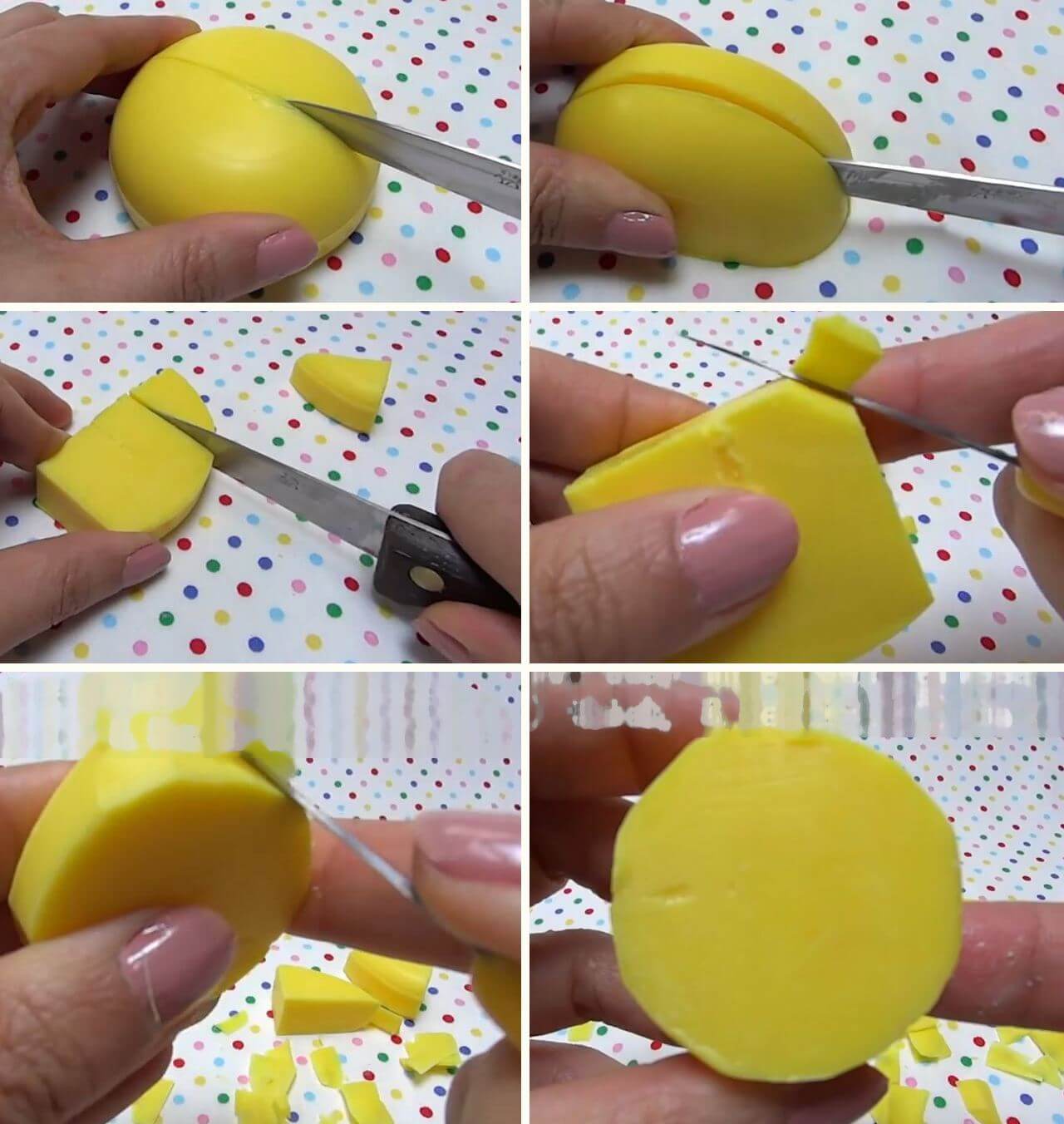 2.1 Cut the yellow soap into round slices. 1.5 cm (5/8") thick, 3.5 cm (1-1/2") in diameter.