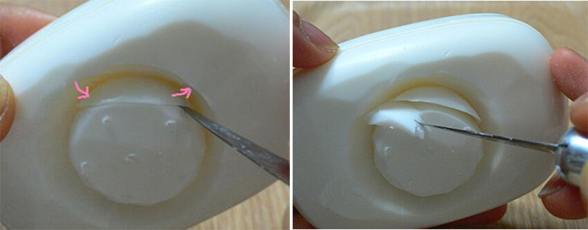 3. Holding your knife at a right angle to the soap, deeply cut a circle along the outline. Tip: Turn your soap with the hand holding it and don't move your knife. Either clockwise or counterclockwise is fine. Then tilting your knife, cut the soap along the circle by turning the soap.