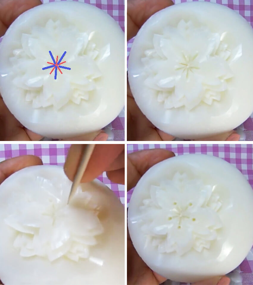5. Cut a flower shape. Each petal is placed inside the dent. Then cut off the soap around the flower shape.