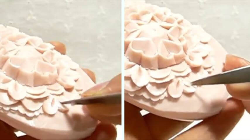 18. Carve finer scalloped lines under previously carved scalloped lines and remove soap around them.